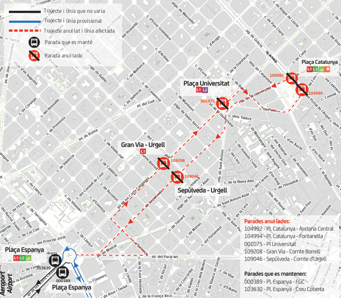 • Dirección centro ciudad: Gran Vía – Borrell, Pl. Universitat y Pl. Catalunya.